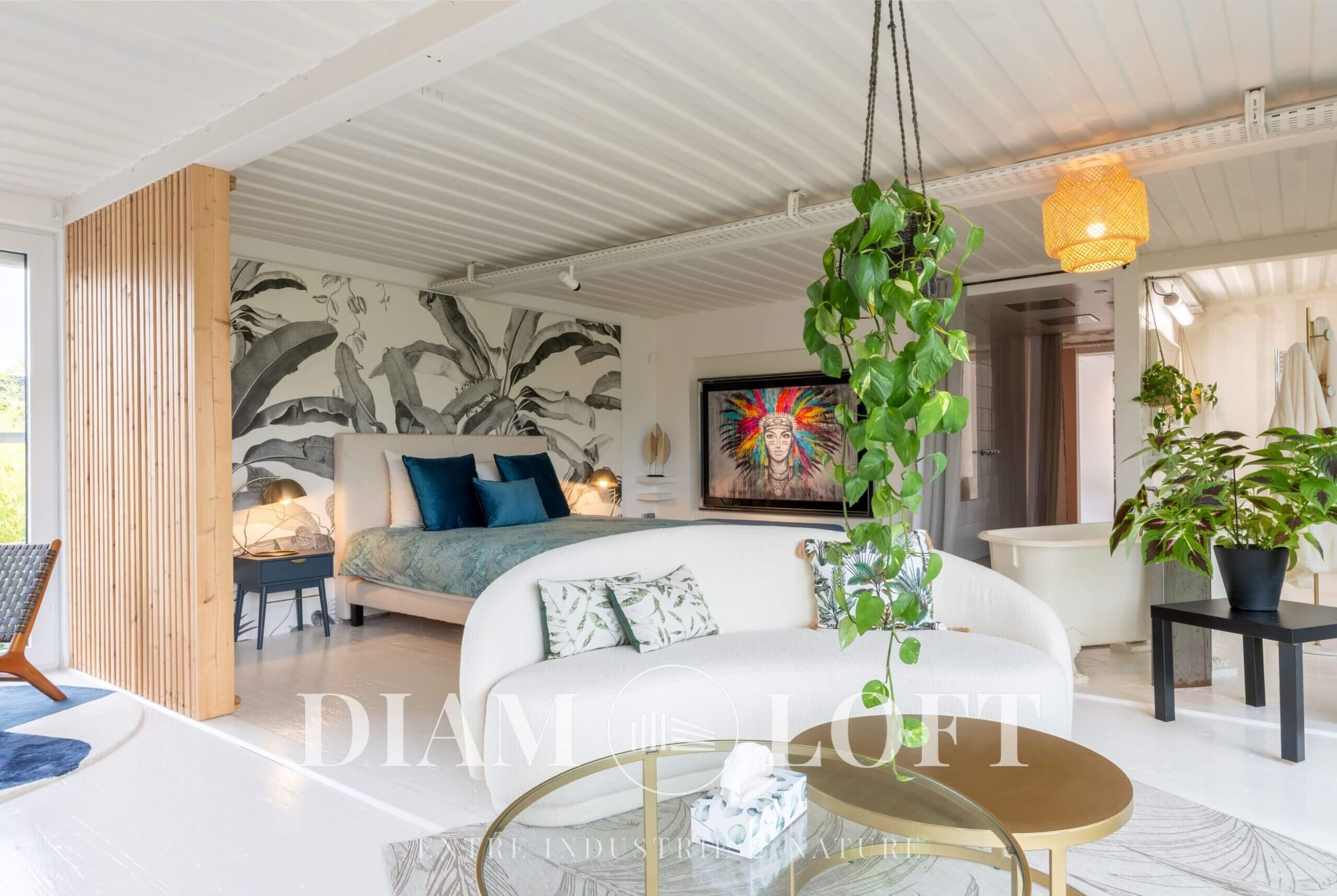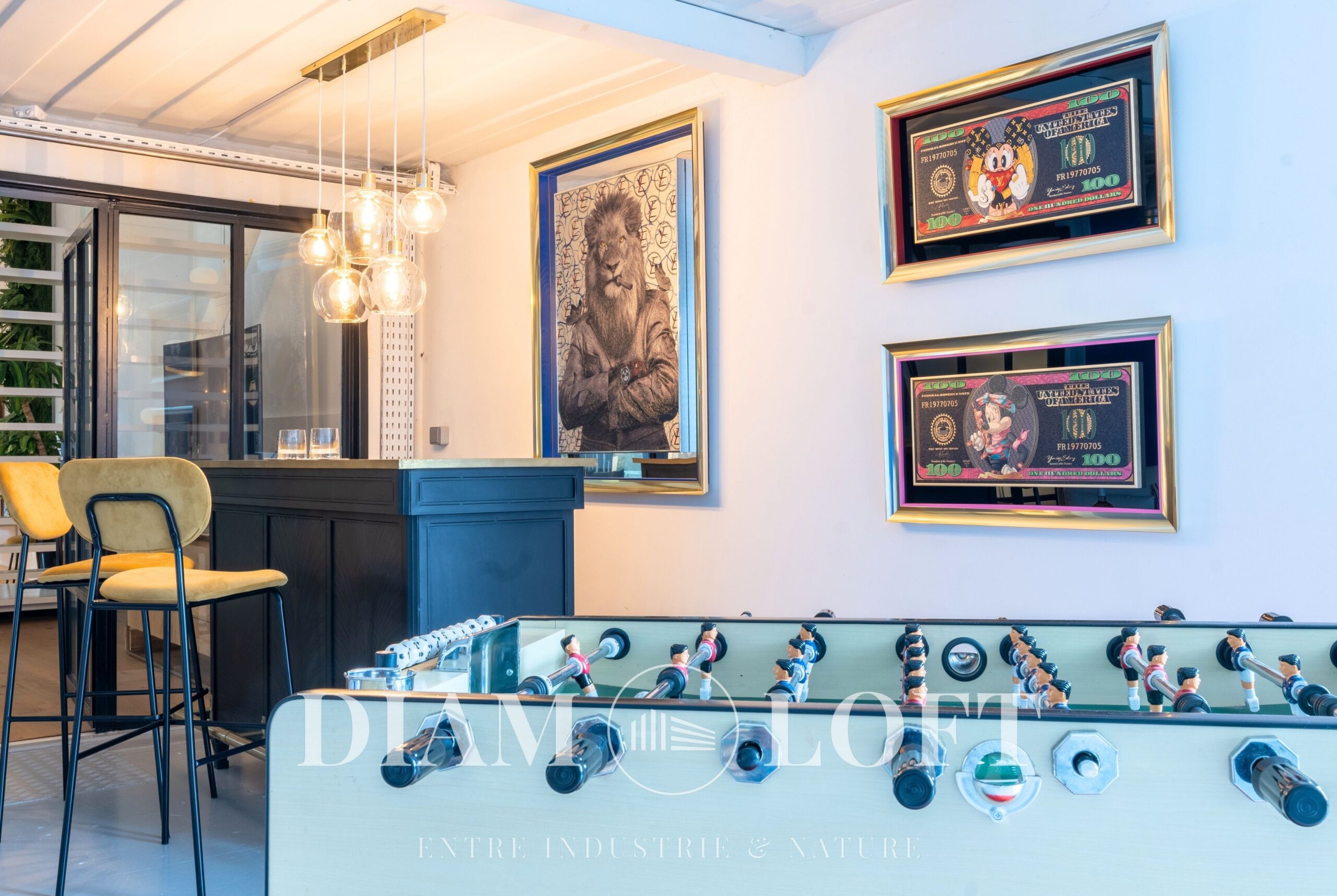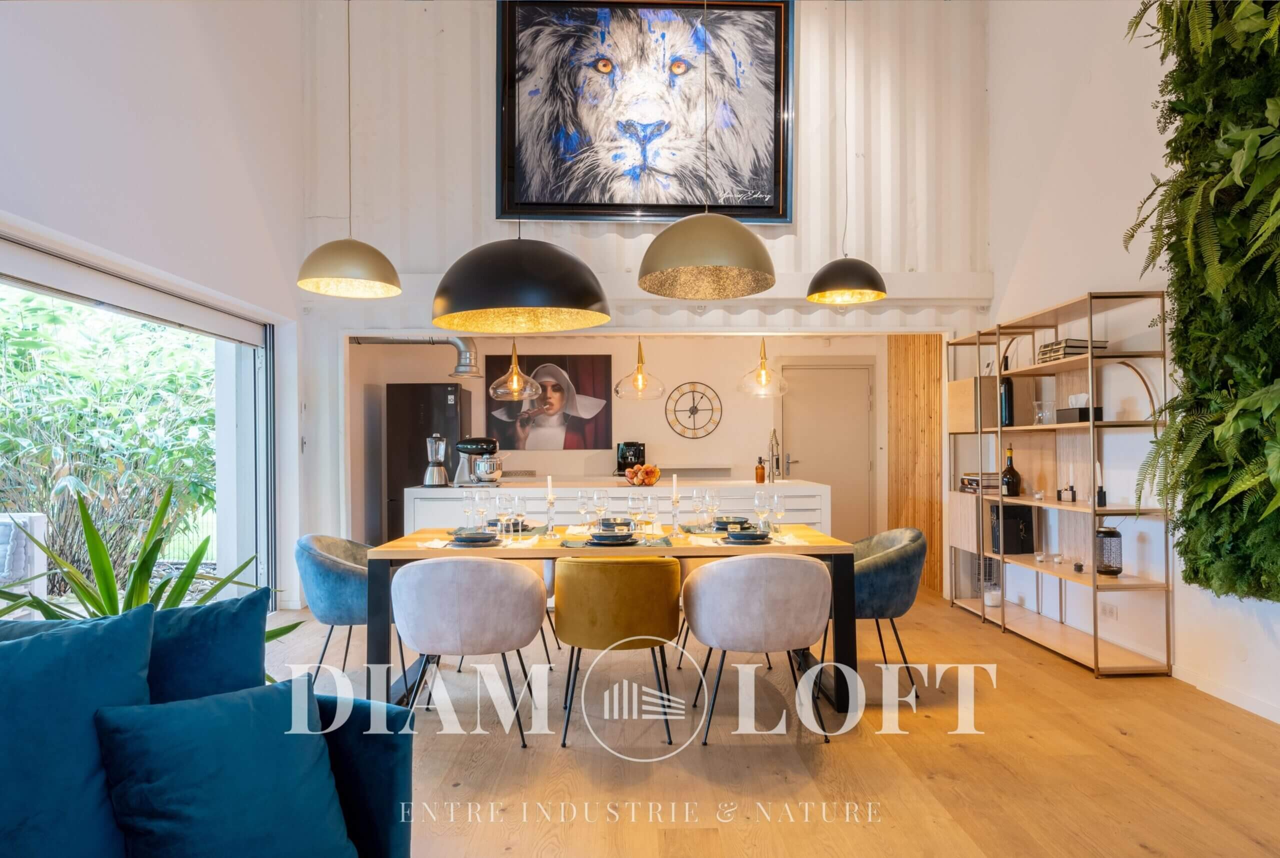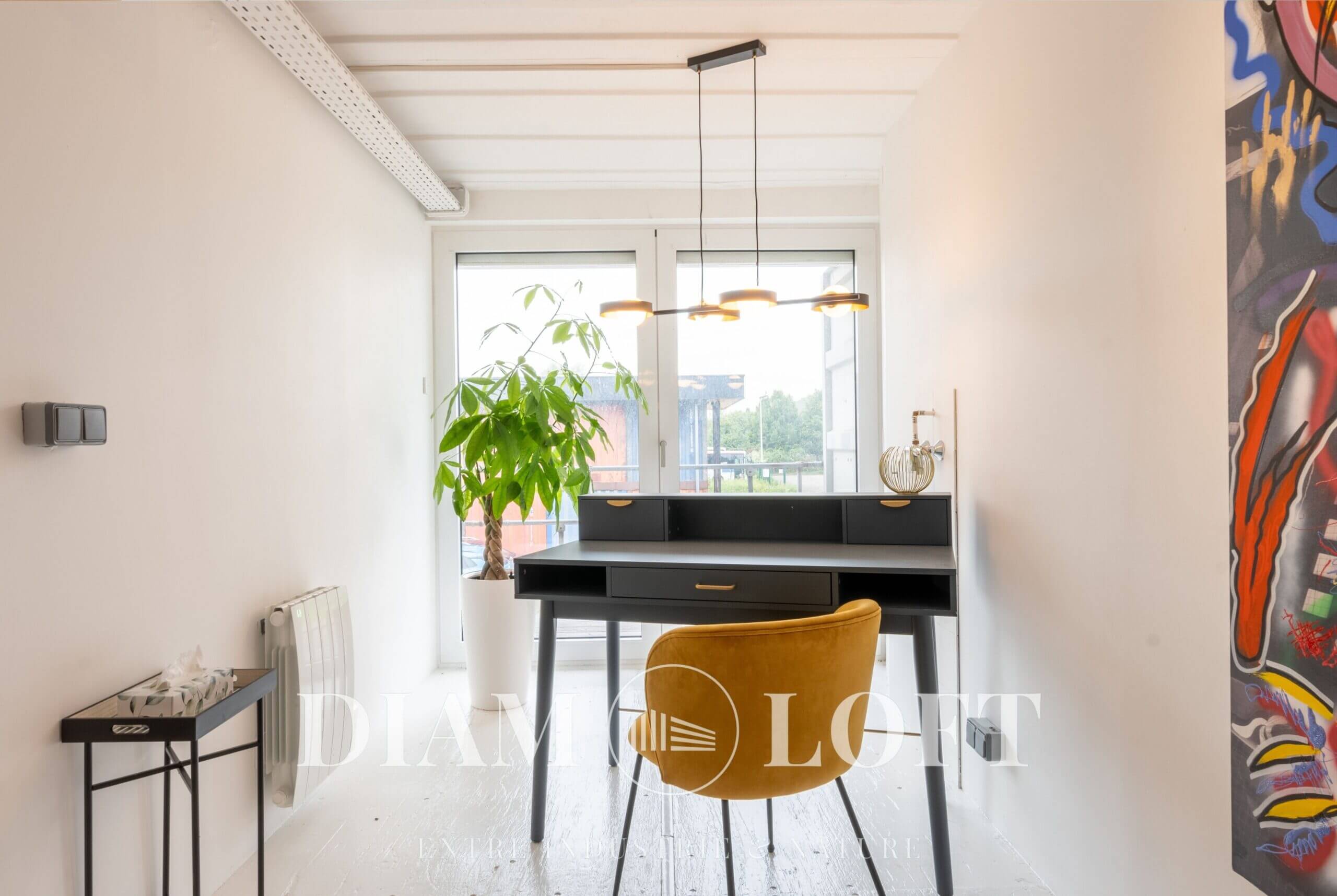 Diam Loft est un concept unique où l’originalité rencontre la nature. Implanté dans un environnement à la fois industriel, créatif et verdoyant, ce lieu offre un équilibre rare entre énergie urbaine et sérénité. Sa façade, graffée par l’artiste Jaek El Diablo, lui confère une identité forte et reconnaissable dès le premier regard. À l’intérieur, la décoration a été soigneusement pensée autour de nombreuses œuvres d’art, créant une atmosphère immersive et stimulante.